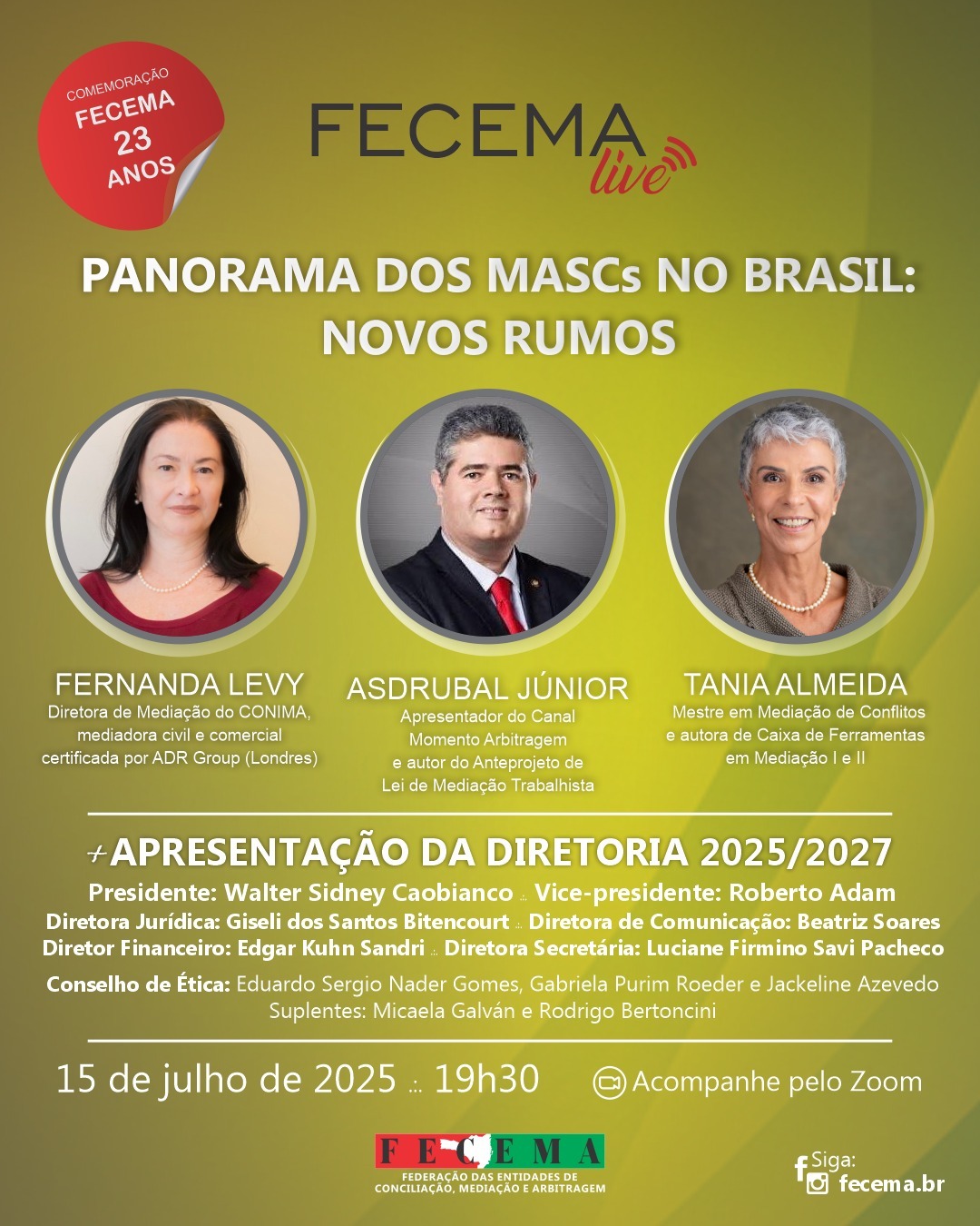 EVENTO ALUSIVO AO LANÇAMENTO DA COMPETIÇÃO DE MEDIAÇÃO FECEMA, onde traremos as possibilidade profissionais que se abrem para jovens profissionais que conhecem e dominam as ferramentas extrajudiciais de resolução de conflitos, como a mediação.